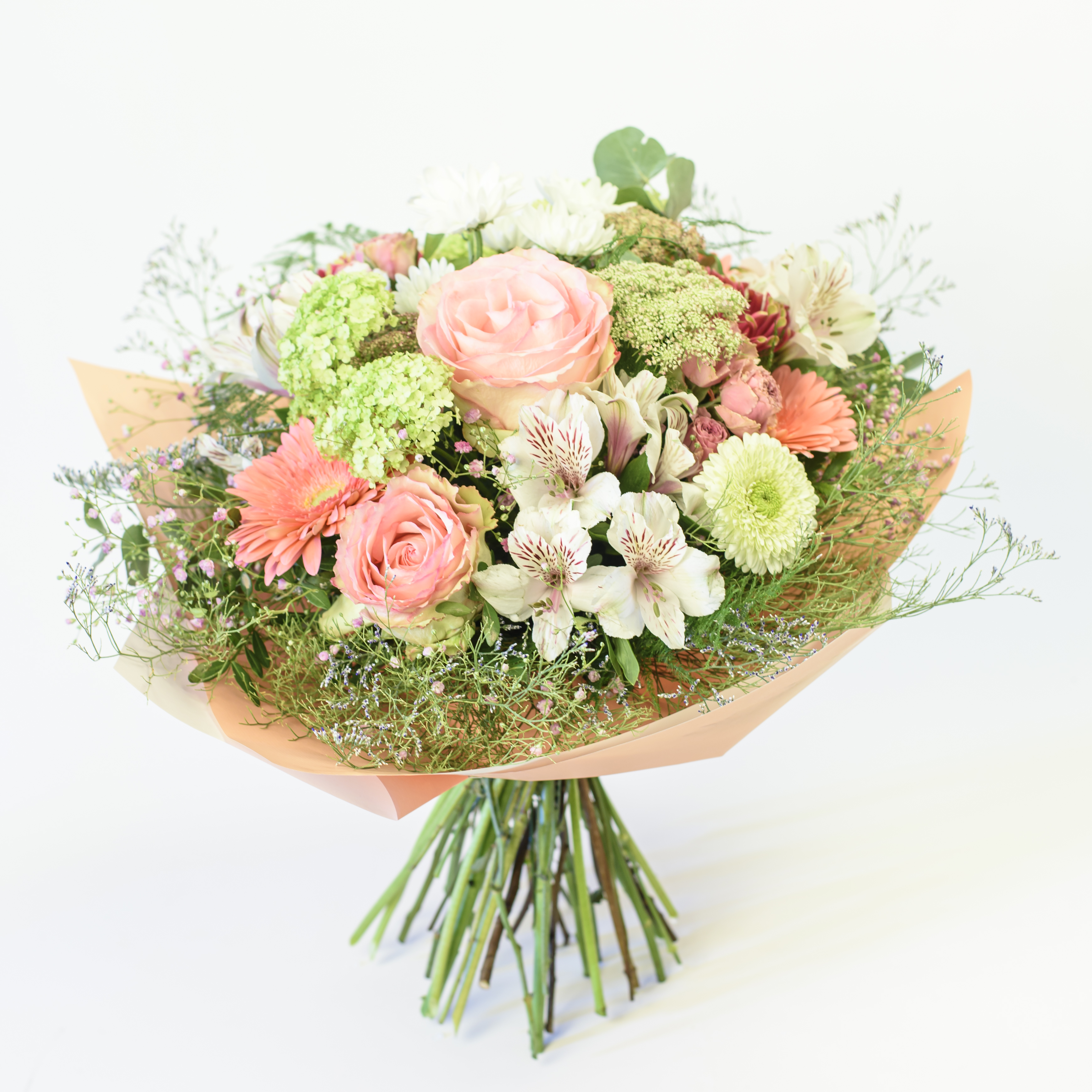 Kompaktní kulatá kytice ve světlých pastelových barvách udělá radost každé ženě. Pečlivě vybraná kombinace několika druhů květin doplňuje zeleň a manžeta z barevného papíru.
