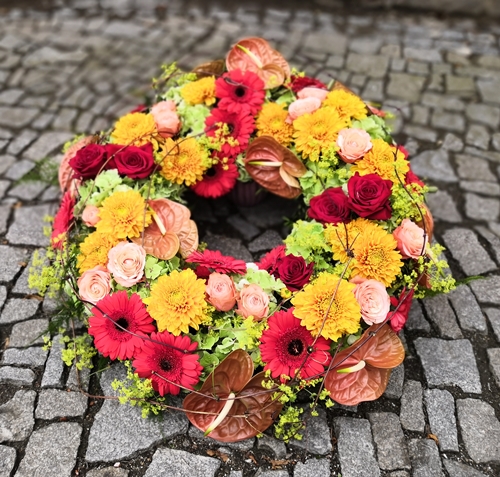 Tento exkluzivní věnec je bohatě zdoben květy a zelení po celém obvodě. Stonky jsou vypichovány do korpusu z aranžovací hmoty, a tudíž květy mají zaručený přísun vody. Dle přání rádi upravíme barevnou kombinaci květů. Věnec můžeme doručit do kostela či smuteční síně před obřadem a o její vystavení se postarat osobně.